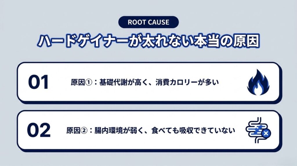 - 太れない本当の原因は「基礎代謝の高さ」と「腸内環境の弱さ」