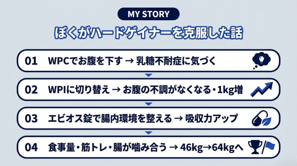 ぼくの場合、ほぼ全部当てはまっていました。特に「胃腸が弱い」は、後にWPI切り替えにつながる大事なポイントでした(詳しくは後述します)。