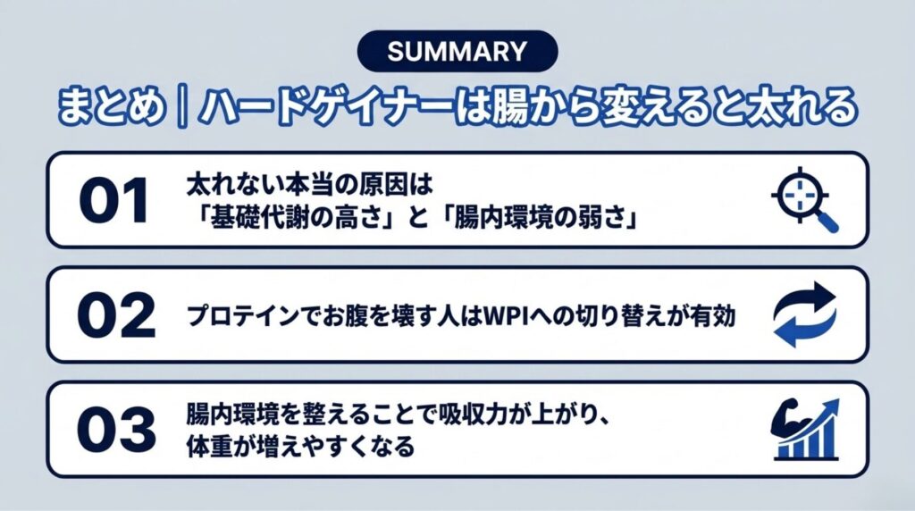 「食べても太れない」体質は、正しいアプローチで必ず改善できます。まず自分の腸の状態を見直すことが、増量への一番の近道です。