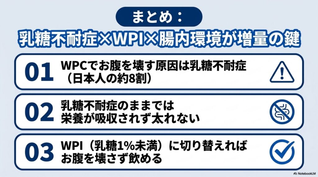 まとめ:乳糖不耐症×WPI×腸内環境が増量の鍵だった
